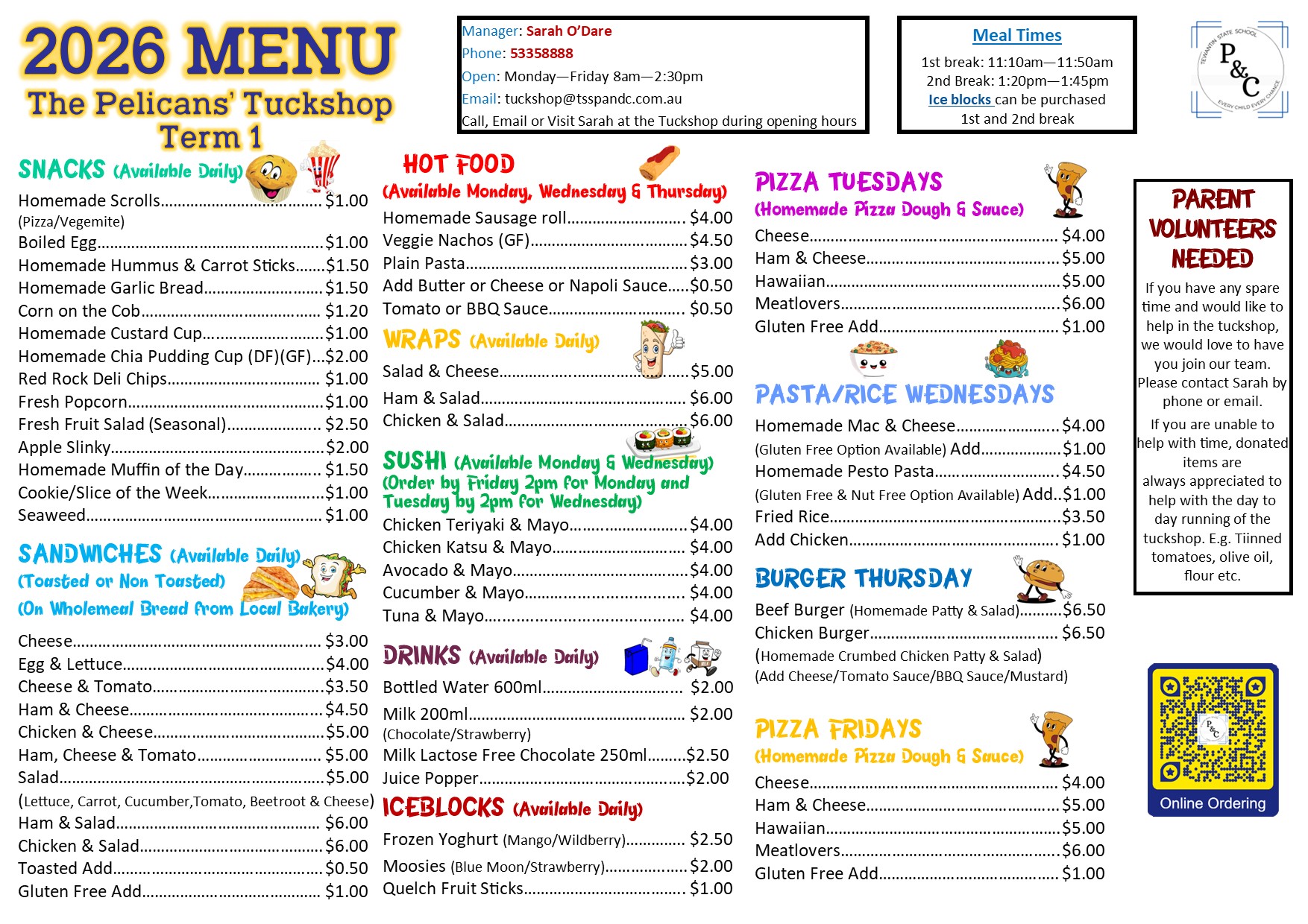Pelicans' Tuckshop is committed to providing a healthy and nutritious menu with a variety of lunch, snack and drink options for both 1st and 2nd breaks. Our Pelicans' tuckshop convenor prepares the majority of our food onsite, with the exception of Sushi and some snacks and drinks.